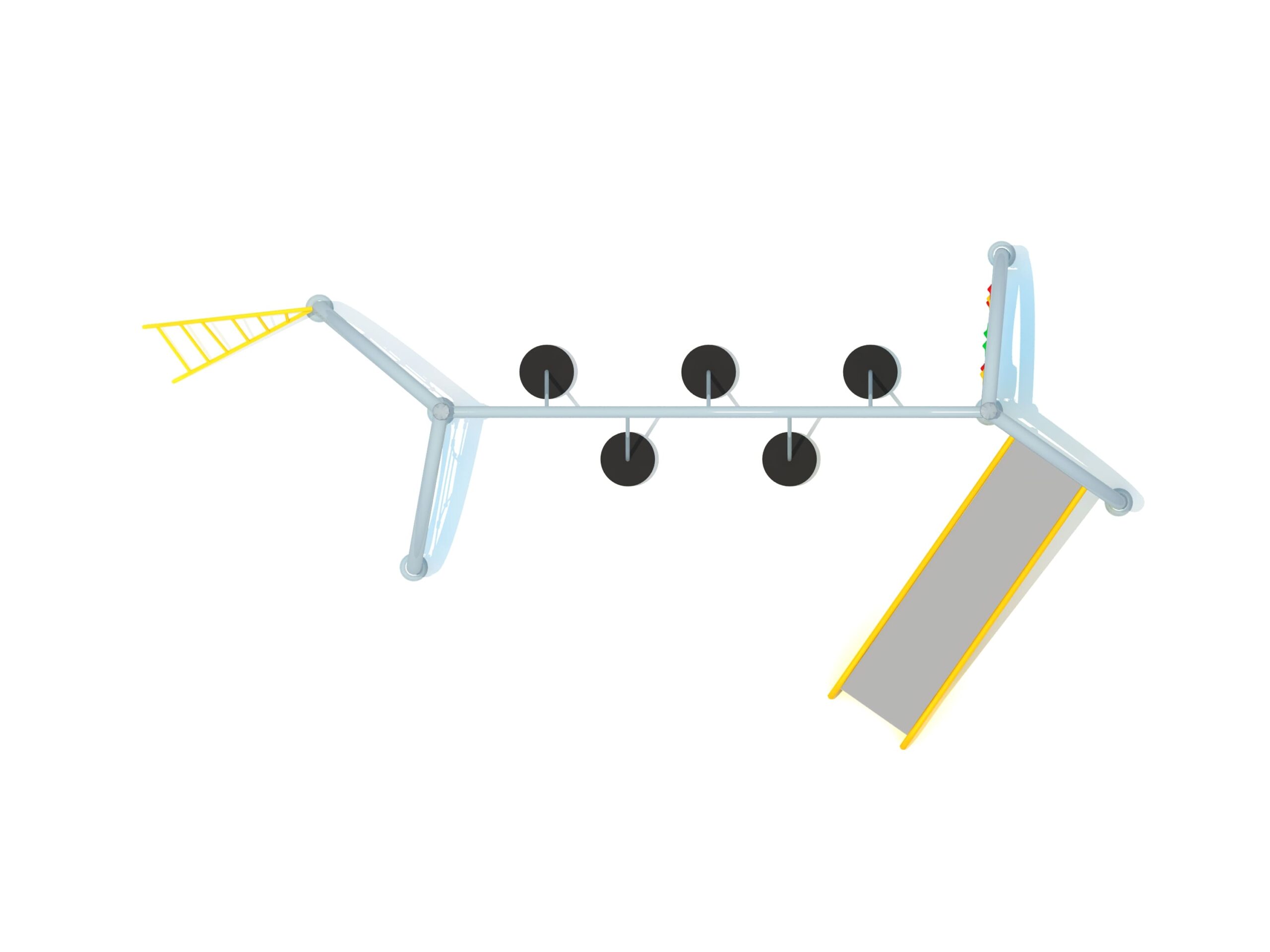 Estructura en acero galvanizado, plásticos en rotomoldeo, plataforma y escaleras con recubrimiento en PVC. Tobogán en acero inoxidable